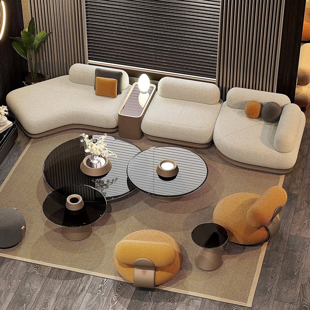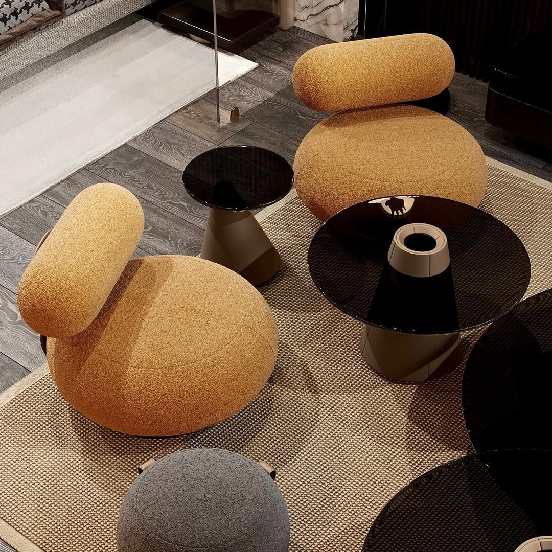 تصميم نحتي فريد: تتميز الكنبات بتصميمها غير المتماثل الذي يشبه الحصى الناعمة (Pebble-like)، بينما يأتي الكرسي الفردي كقطعة فنية ملتفة تجمع بين مواد مختلفة بجرأة وأناقة.