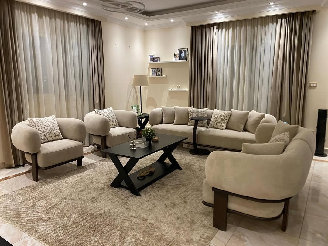 مكونات المجموعة : كنبة ثلاثية، كنبة ثنائية، 2 فوتيه .