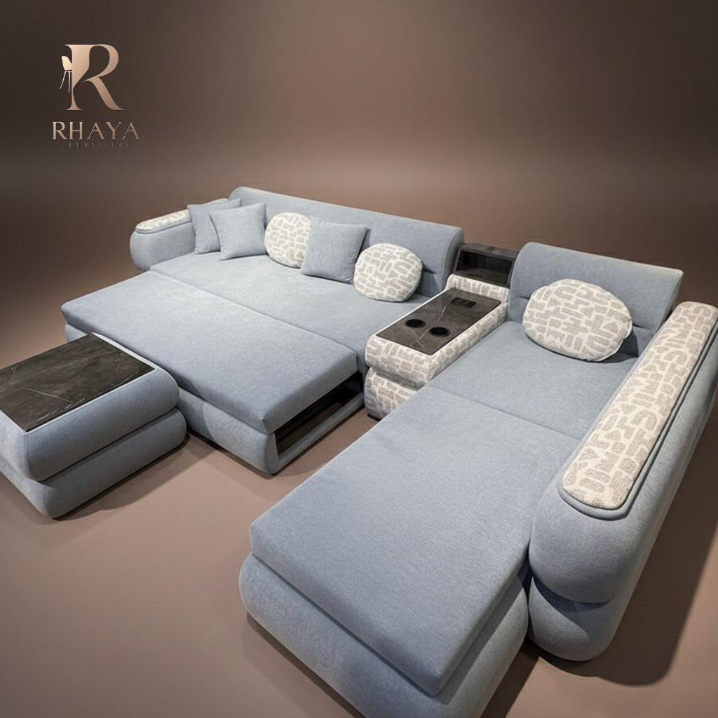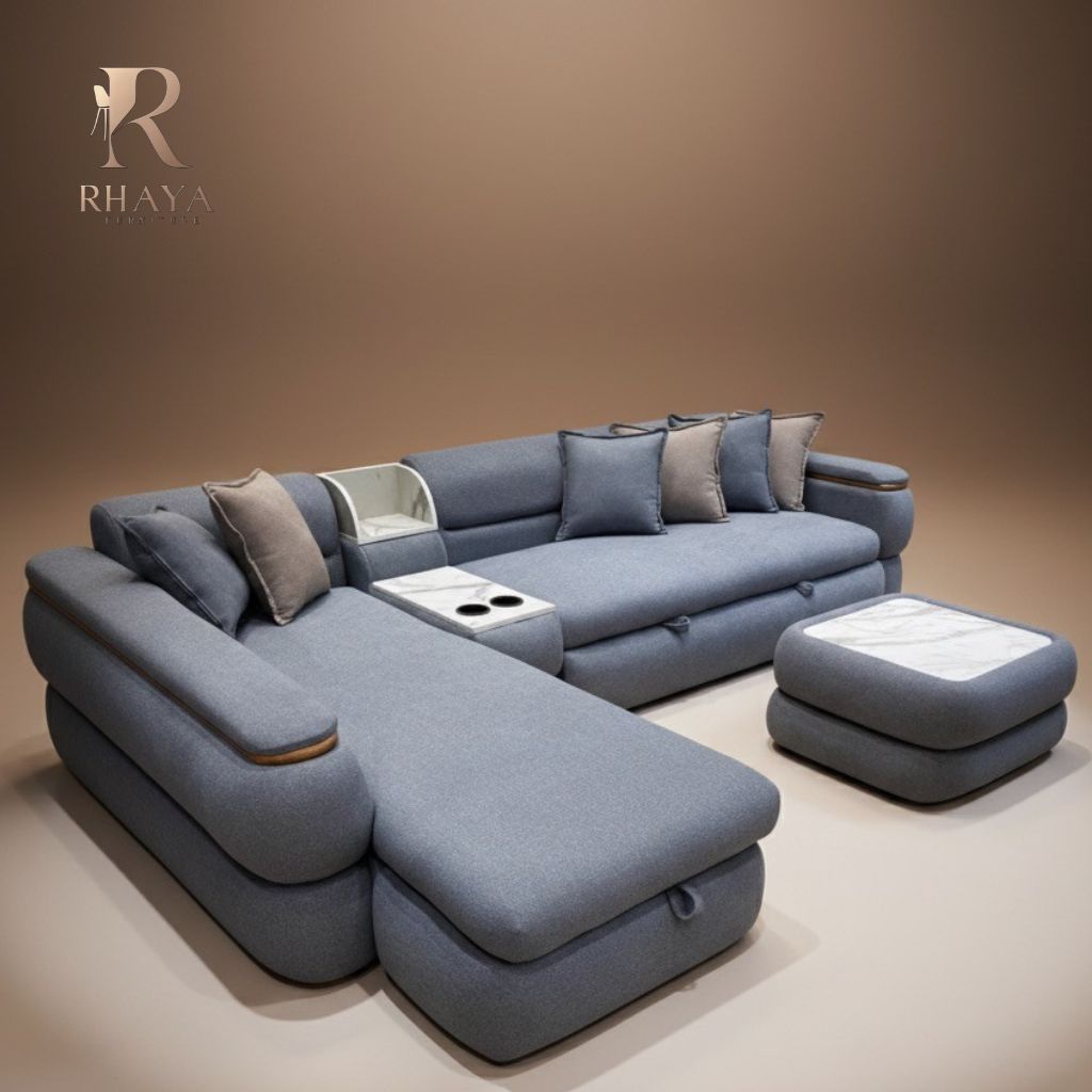 الخامات الأساسية : الهيكل: خشب زان أحمر روماني مجفف . القماش: قماش بوكليه ناعم (متاح تغيير لون ونوع القماش). الاسفنج: كثافة 38