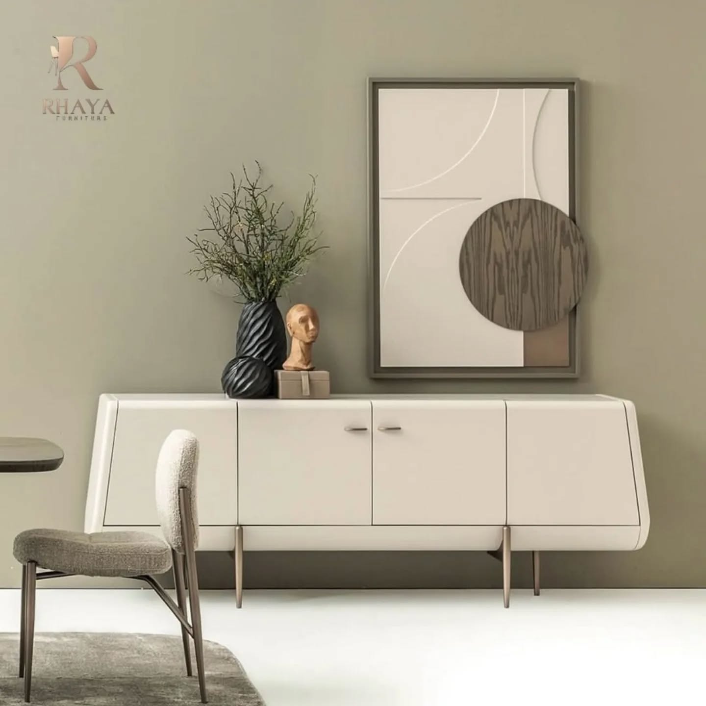 الخامات الأساسية :الهيكل: خشب زان أحمر مجفف. الأسطح (الطاولة والبوفيه): كونتر. التشطيب: دهان بروتان احترافي. الكراسي: هيكل معدن مع تنجيد قماش بوكليه، إسفنج سوفت عالي الكثافة.