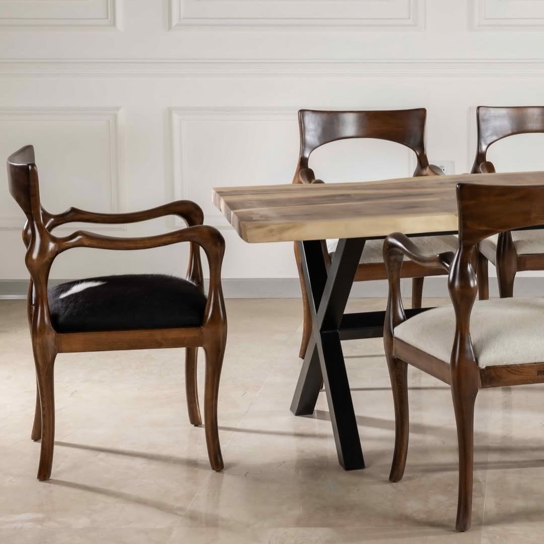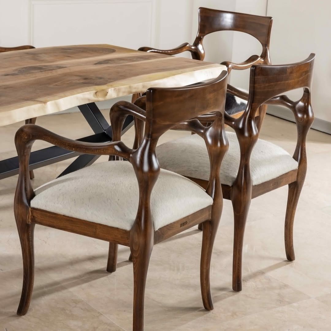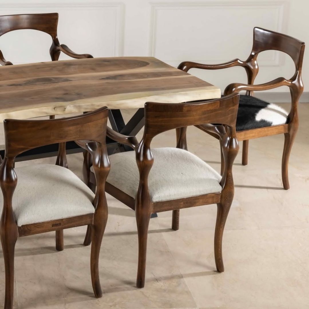 الخامات الأساسية :الطاولة (السطح): لوح خشب جوز طبيعي غير منتظم (Live Edge Slab). قواعد الطاولة (الأرجل): خشبية بتشطيب دوكو فرن. الكراسي: خشب زان أحمر مجفف للنحت. التنجيد: جلد طبيعي مُشعّر أو قماش بوكليه حسب الاختيار ، إسفنج سوفت عالي الكثافة