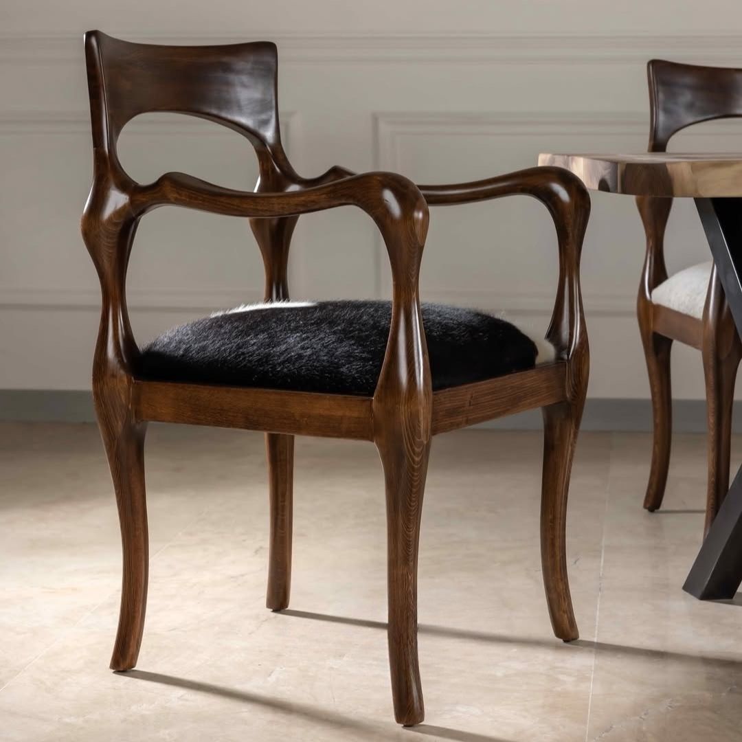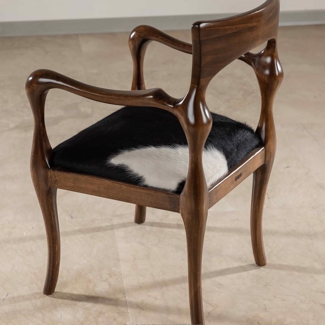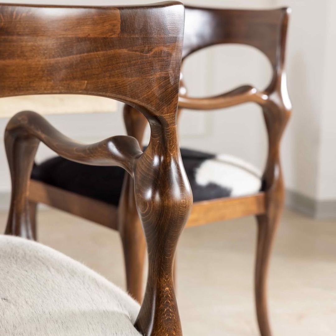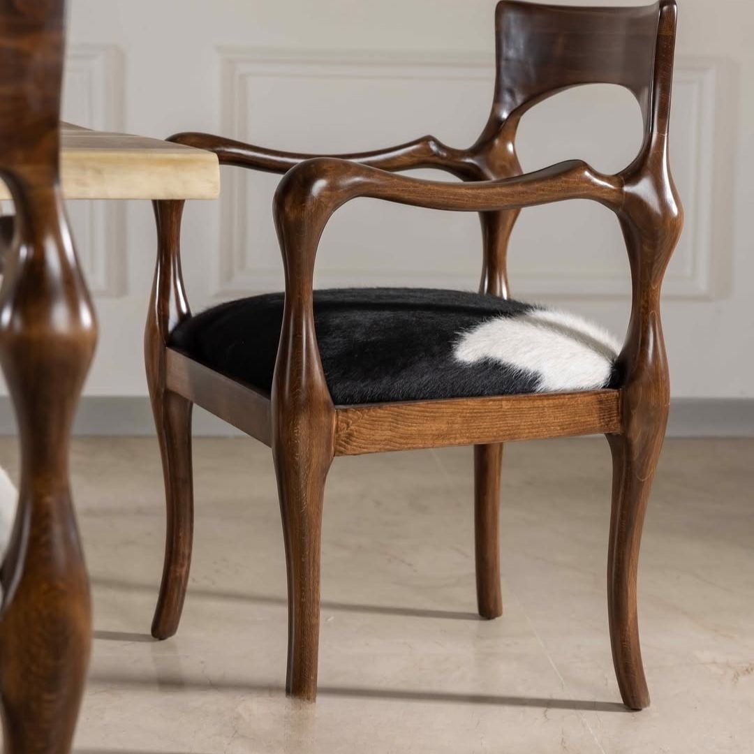 الخامات الأساسية :الطاولة (السطح): لوح خشب جوز طبيعي غير منتظم (Live Edge Slab). قواعد الطاولة (الأرجل): خشبية بتشطيب دوكو فرن. الكراسي: خشب زان أحمر مجفف للنحت. التنجيد: جلد طبيعي مُشعّر أو قماش بوكليه حسب الاختيار ، إسفنج سوفت عالي الكثافة