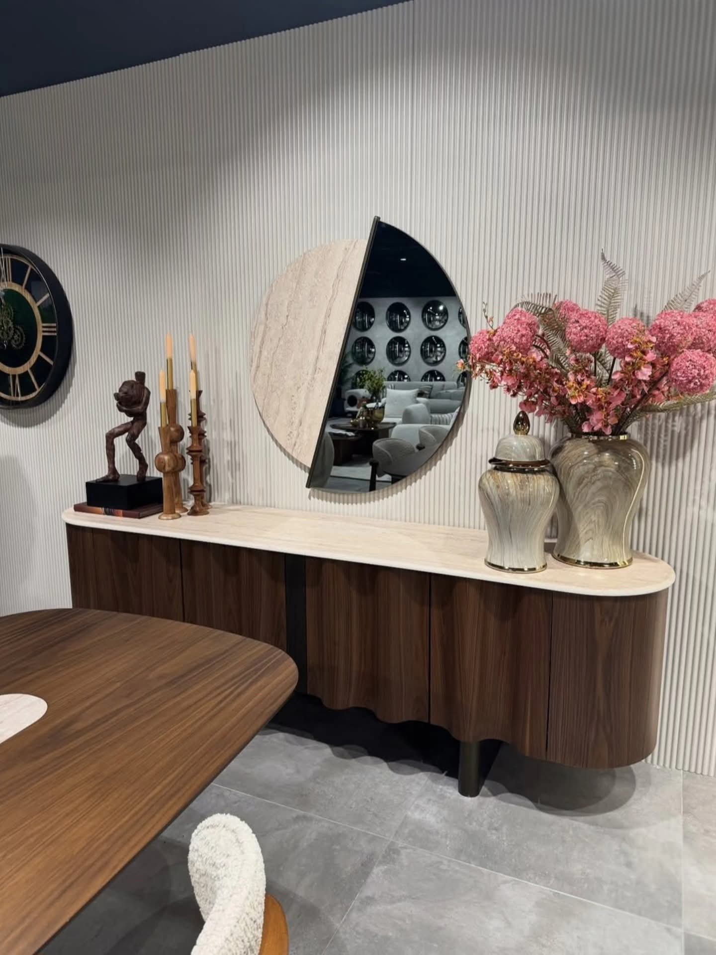 مكونات المجموعة :طاولة طعام (بيزاوية)، 6 كراسي، بوفيه، مرآة حائط (دائرية).