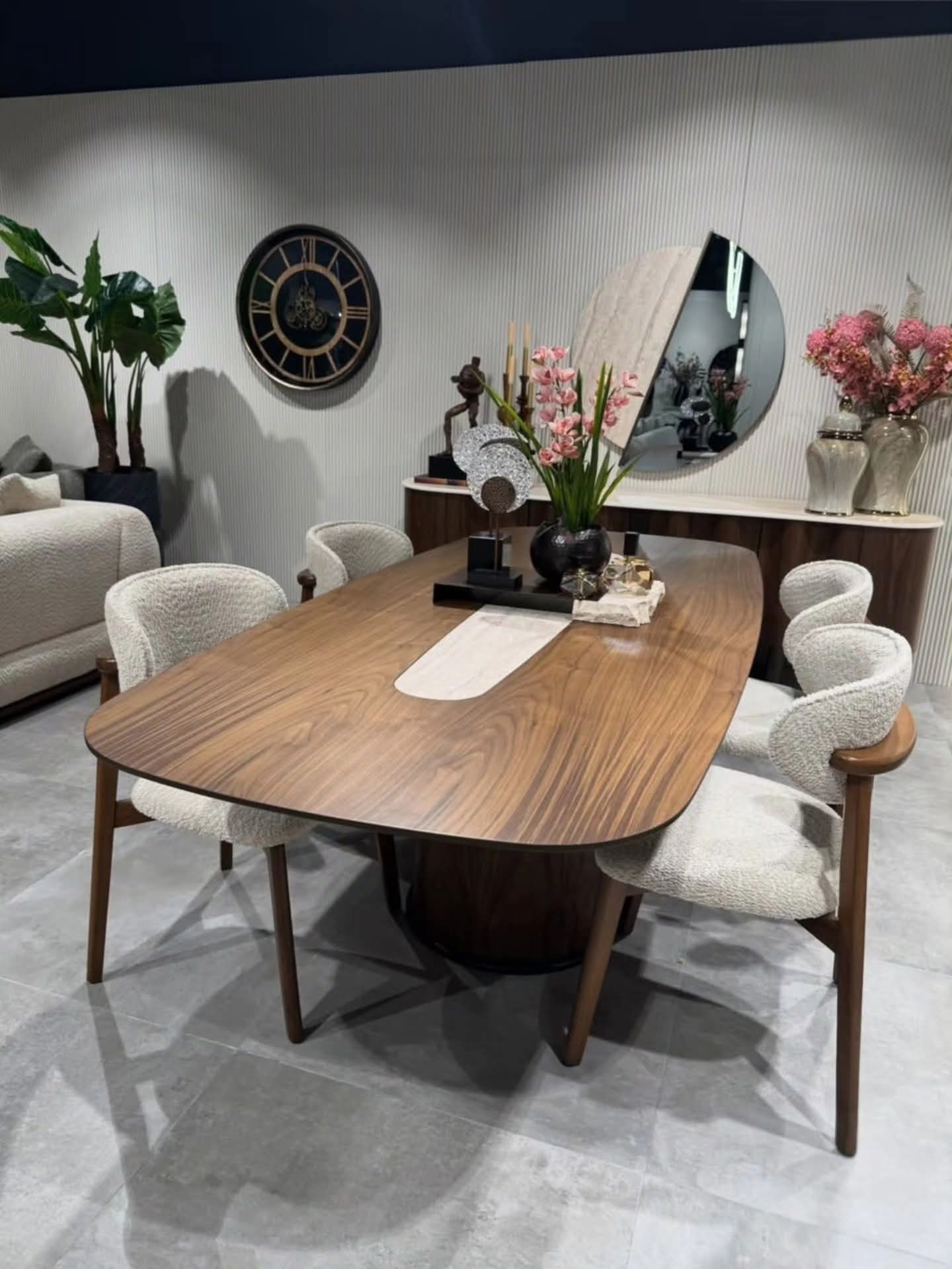 الخامات الأساسية :الهيكل: خشب زان أحمر مجفف. الأسطح (الطاولة والبوفيه): كونتر طبقات. التشطيب: دهان دوكو فرن (لون الخشب الداكن). الطاولة: سطح خشبي مدمج (Inlay) بقطعة رخام في المنتصف. الكراسي: خشب زان، تنجيد قماش عالي الجودة، إسفنج سوفت عالي الكثافة