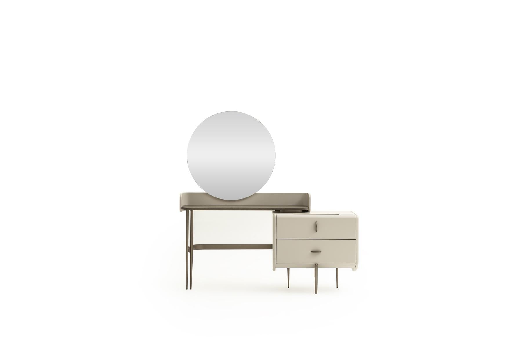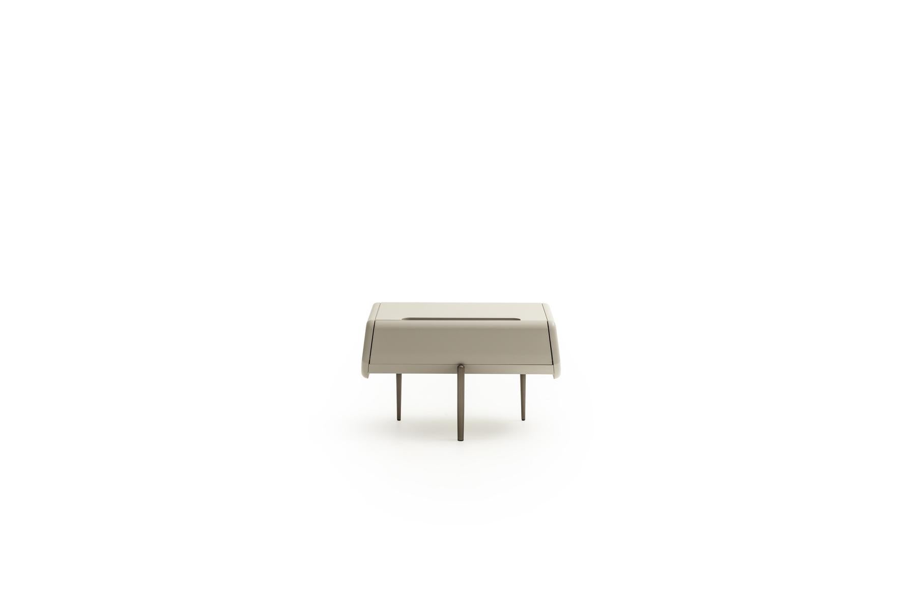 كومود بتصميم فني: قطعة فريدة بخطوط انسيابية ومستقبلية. يتميز بتصميمه الذي يشبه الكبسولة الناعمة، مع أرجل معدنية رفيعة تضفي لمسة من الخفة والرقي. يوفر مساحة تخزين عملية ومخفية تحافظ على المظهر النظيف والبسيط للمكان.