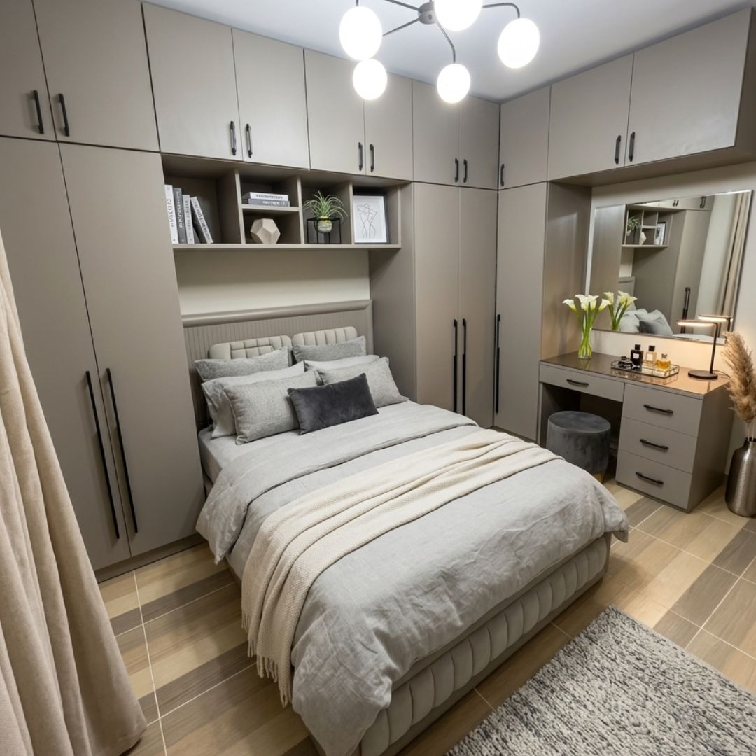 • استغلال ذكي للمساحات: خزانة ملابس (دولاب) مدمجة حول السرير لتوفير أكبر قدر من التخزين دون إزحام الغرفة.