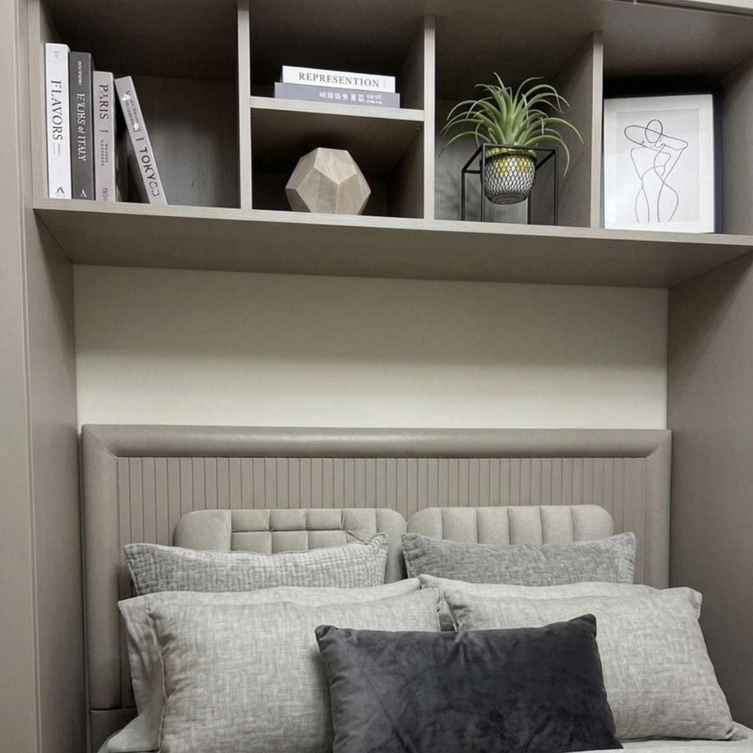 • أرفف ديكور علوية: مساحات مفتوحة فوق السرير لإضافة لمساتك الشخصية من كتب أو نباتات زينة.