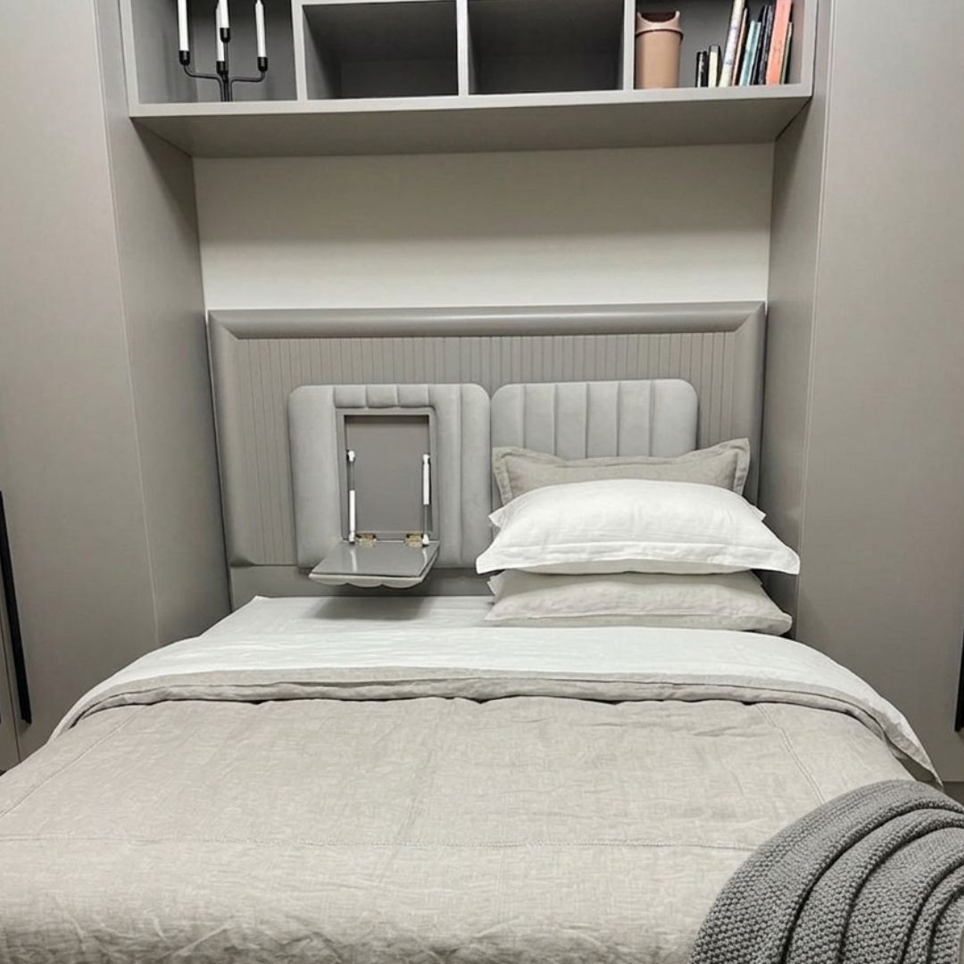 • ظهر سرير مبطن ومريح: يتميز السرير بظهر قماشي مبطن بتصميم طولي يمنحك راحة مثالية أثناء القراءة أو الجلوس مع رف قابل للفتح والغلق للإفطار والمشروبات.