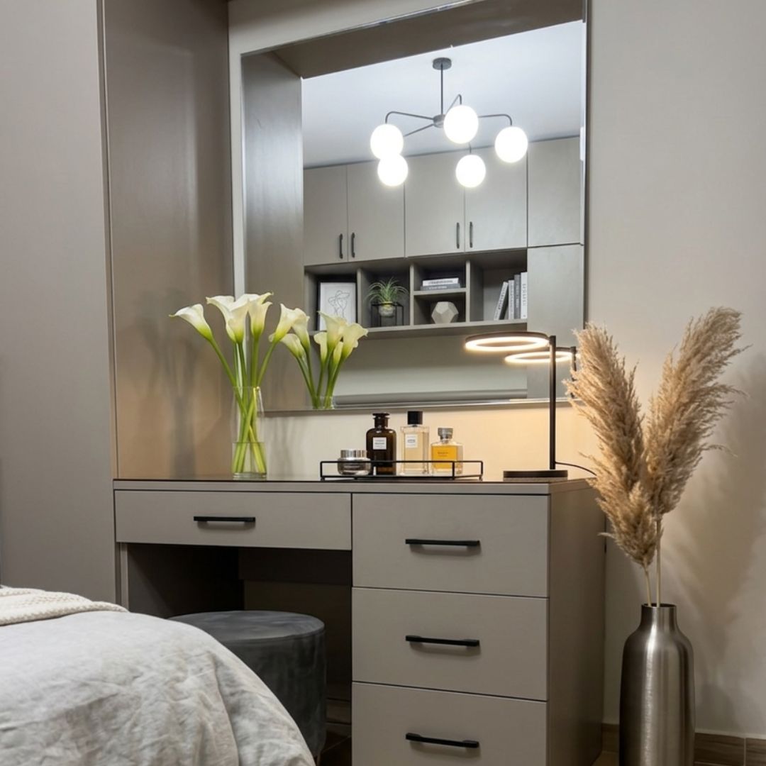 • ركن التجميل (تسريحة): مكتب مكياج مدمج مع مرآة واسعة وإضاءة عصرية، مصمم ليتناسب مع نسق الغرفة.