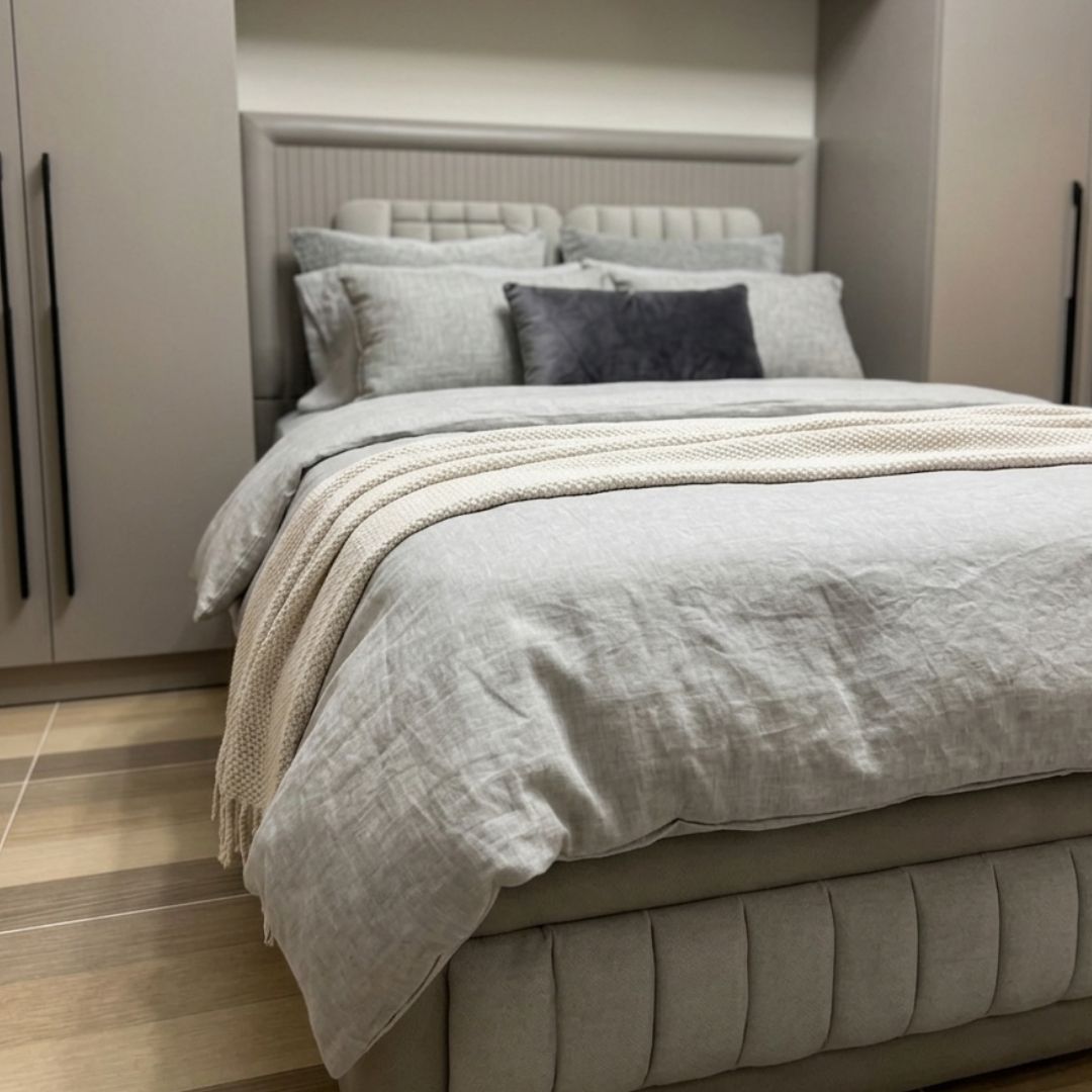 • المكونات: سرير مزدوج + خزانة ملابس مدمجة + تسريحة مدمجة + أرفف علوية.
